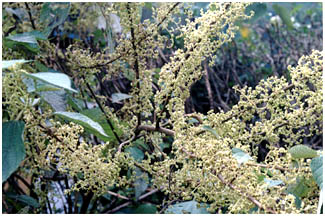 皮は長くはがれます。茎を蒸して繊維を集めて織りものをつくります。