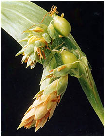 から外に出て垂れ下がります。穂にはおばなが集まり風によって花粉を散らします。花粉は特別に強いにおいがします。