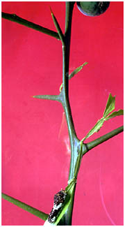 - 長さが2〜3cmにもなる緑色のとげを持っています。