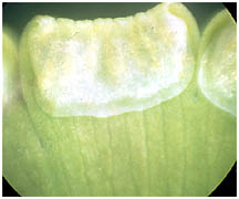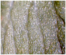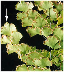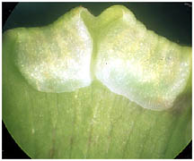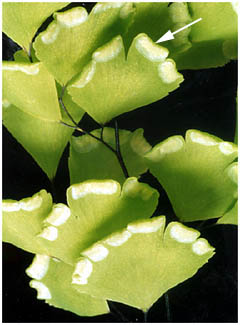 若い包膜(写真左2枚)をめくると、その下の葉脈の上に胞子のう群(写真下2枚)がつきます。 |