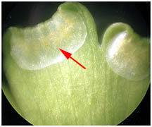 [小葉と包膜、若い包膜(矢印)はうすく半透明]