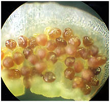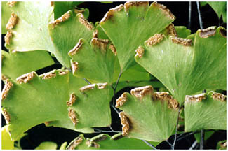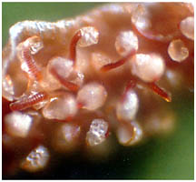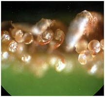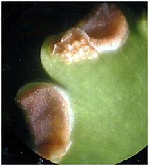 胞子のうが熟すと褐色になった包膜は巻き上がります。胞子のうから胞子が飛び出しやすいようになります。