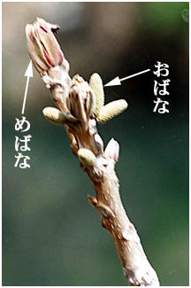 - おばなは前年の枝先に緑色で垂れ下がります。
