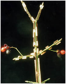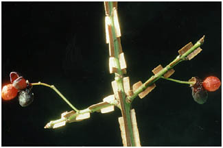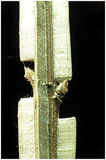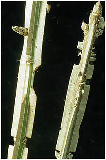 直交(90度に)して左右に矢羽のように付きます。左右でずれています。