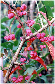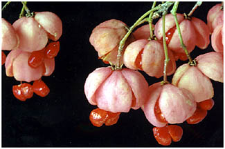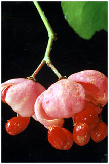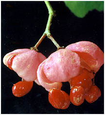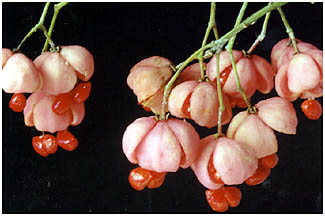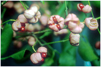 表面から4片に割れて朱紅色の仮種皮に包まれた種子があります。