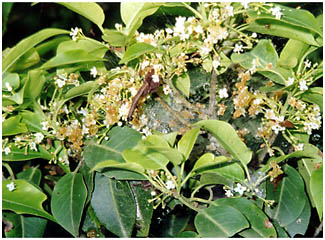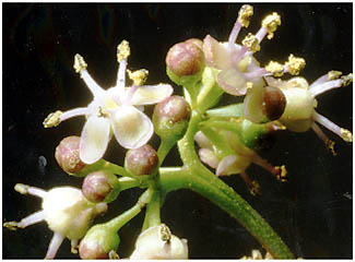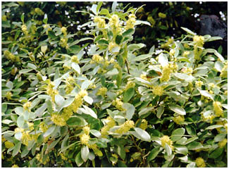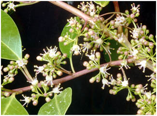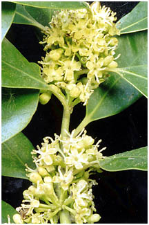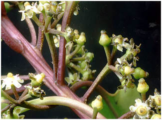 花は目立ちませんが多くの花が集まります。雌雄異株です。4数性(花弁が4、おしべが4)の花です。