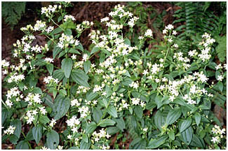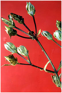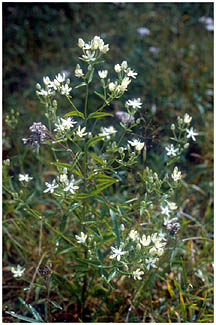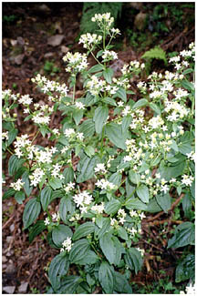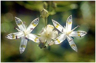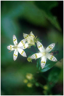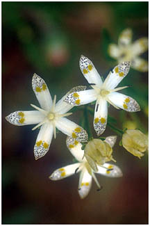 - 枝分れした先に長い柄のある花をつけます。白い花です。がくは緑色で5裂します。それぞれの花冠には緑色と黒紫の小さい点がつく。おしべは5本です。