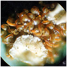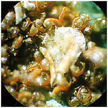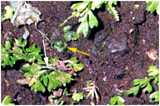 は発芽し、前葉体(配偶体:写真黄色矢印)をつくります。