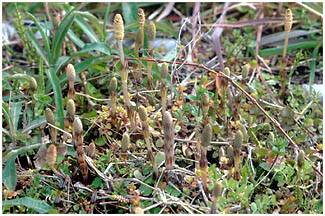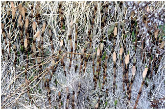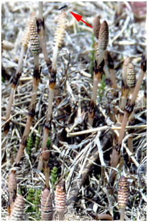 ※ツクシは胞子を専用につける茎、胞子茎といいます。坊主とは胞子をつけた穂の部分です。さや・袴(はかま)は輪になって出た葉です。 |
