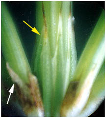 ※茎と枝。枝は節から規則正しく出ます(写真右)。 |