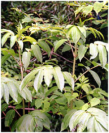 (2) 枝分かれはほとんどせず、対生状に葉をつけます。葉は奇数羽状で複葉です。小葉にはきょ歯があります。 |