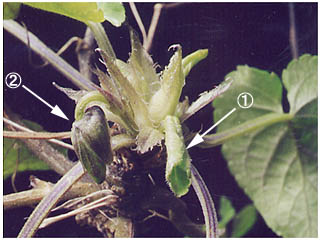 根元に近いところを見てみると、葉芽(1)と花芽(2)の両方が用意されていることが分かります。