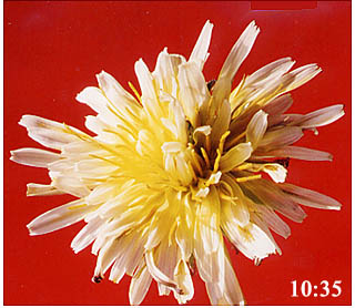 実験をしてみました。2001年1月31日、快晴の日、部屋の中で水にさしたシロバナタンポポの花の開き方を追いかけてみました。みんなも身近なタンポポでやってみよう。
