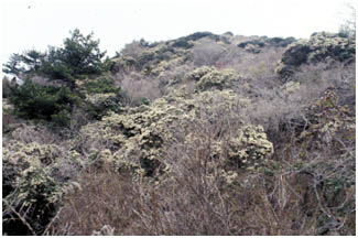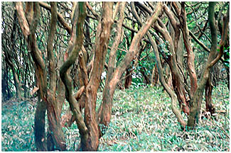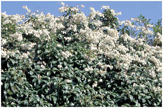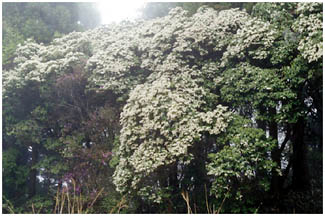 [霧の中で花を咲かせるアセビ、2000.4.29.]