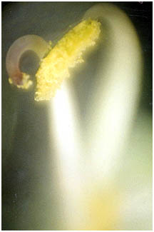 - めしべはこの写真ではまいていてのびていません。長いおしべと同じように長くのびます(上右の写真)。