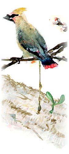 - ヒレンジャクは群がってやってきて実を食べる。食べてふんを出すとき、とりもち(果肉)といっしょに種子が木の幹にくっつく。幹にしっかりとくっついた種子はそこで芽を出し、大きく育っていくんだよ。