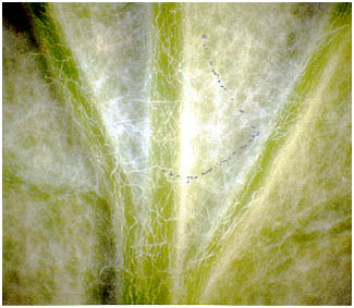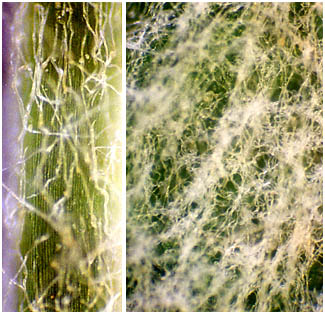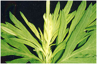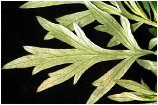 についていて、だ円形で羽状に深く裂けています。上面は緑色、裏面は白い綿のような毛を密につけています。