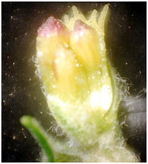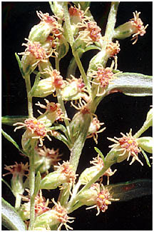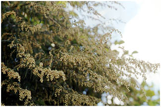 花は小さな円すい花序で下を向いて咲きます。管状花で、中央部は両性花になっています。