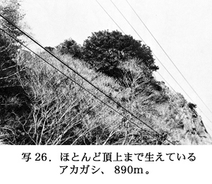この両種の見分け方のポイントは葉にあります。アカガシの葉の縁には細かな切れ込みがなく(全縁)、長い葉柄です。これにくらべてアラカシの葉は小さなギザギザの切れ込み(鋸歯状)があり、短い葉柄です。何よりも違うのは、生えている高さで、アカガシは、ウラジロガシほどの高さまで登り、六甲山では北斜面でも南斜面でも870、880メートルの高さにも生えています。多いのは500ートルぐらいから800メートルにかけてイヌブナと似た高さに生えるカシです。