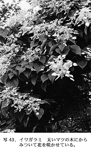 イワガラミは、アジサイと同しユキノシタ科の植物で、茎はつるになり、気根を出して岩や木にからみつきます。広卵形で長い柄のついた葉は対生し、夏枝先に集散花序の白い小花をつけます。花序の周囲には白色の装飾花がいくつかつきます。口絵10ページ