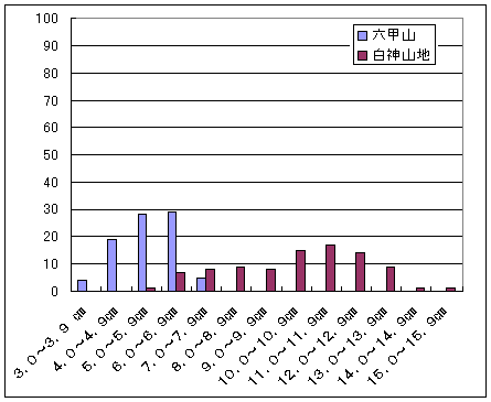 六甲山の葉の大きさの分布は狭い。これは、比較的生育のそろった成樹ばかりが存在することを反映しているのかも知れない。そうだとすると、今ある成樹が滅びると、六甲山のブナ林はなくなるかもしれない。