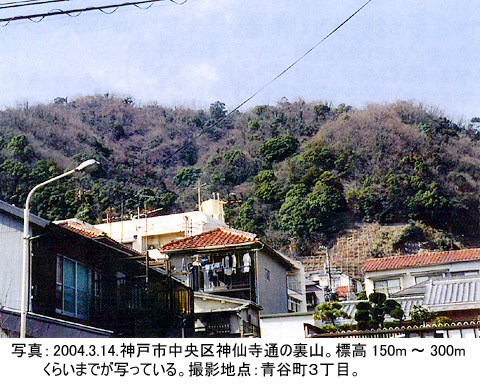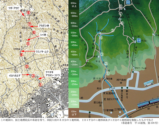 植生のあらまし:年平均気温摂氏15.6度、暖か指数124.7度、寒さ指数−0.7度の神戸地方では、人の介入がなければ、常緑広葉樹の優勢な照葉樹林が成立。特に雨量の少ない瀬戸内にあってはタブを欠くカシ・シイ林へと遷移していく。