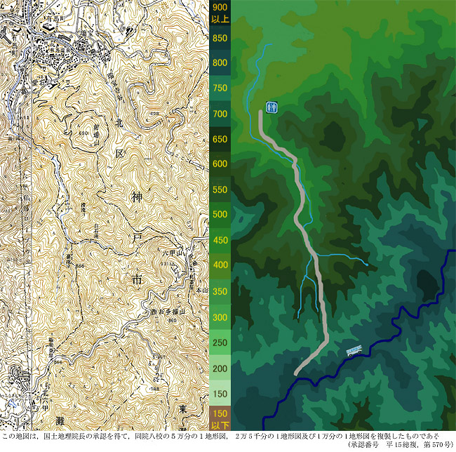 神戸の自然研究グループ著昭和57年3月31日発行の「六甲のブナとイヌブナ林」の50ページ紅葉谷観察図に従って、平成17年1月31日、雪の残る紅葉谷道を写真撮影をしながらたどった。このブナとイヌブナ林の存続を願って、ブナの北限の北海道黒松内町の歌才ブナ林、南限の鹿児島県高隈山のブナ、秋田県藤里町の岳岱自然観察林、徳島県勝浦郡上勝町の高丸山のブナの原生林を訪ね、六甲のブナとイヌブナ林との共通点や相違点を探した。紅葉谷道を有馬へたどる道順に沿って、ブナとイヌブナ林の観察とともにその共通点や相違点を述べる。