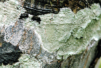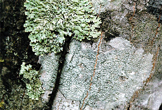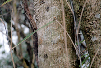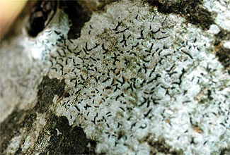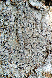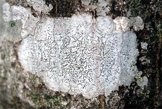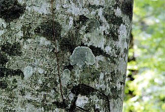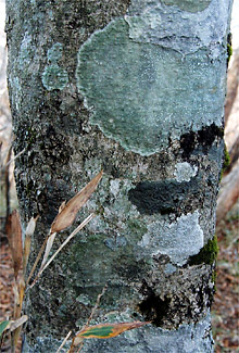 ブナの木肌に共通してついているモジゴケ(神戸市立森林植物園のブナから)