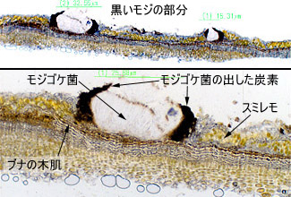 凍結ミクロトームで六甲山のモジゴケを10ミクロンに切り、断面を観察したもの。モジの部分が黒く見える。この断面から、モジゴケは、オレンジ色に見えるスミレモとモジゴケ菌が共生して生きているようすがわかる。共生しているスミレモが光合成してつくった栄養分をモジゴケ菌に与える。モジゴケ菌はスミレモに水分を与える。モジゴケ菌が作った菌糸組織が出した炭素で黒色になっている。 |