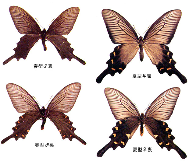 オナガアゲハに似るが胸、腹の側面に暗赤色の毛がある。雄の翅は黒いが雌は黄灰〜褐灰色で容易に区別できる。夏型は大きく、後縁の半月状模様が黄色味をおびる(春型は朱赤)。