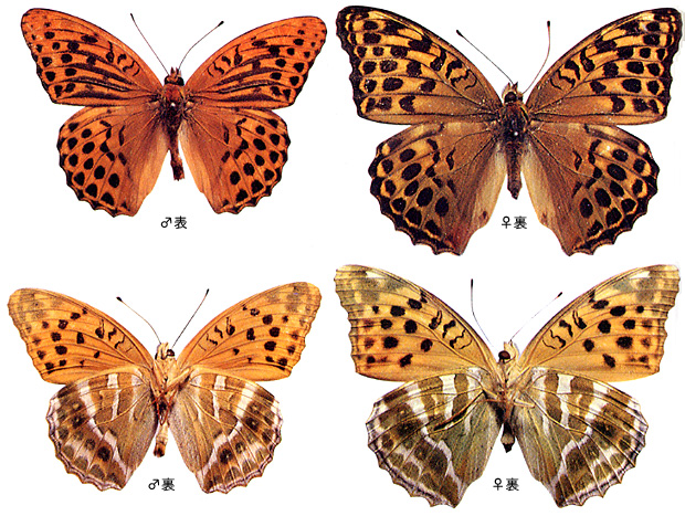 ヒョウモン類はたがいに似ているが、この種は後翅裏面が緑色を帯び、よく目立つ銀条が3本あるので他の種と区別しやすい。雄の方が色調が明るく、前翅表面1b〜4脈に沿って黒条の性標がある。