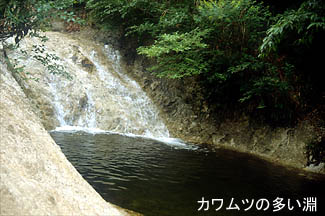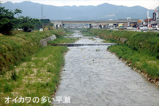 また、同じ中流域にいる魚でも、瀬と呼ばれる流れのはやい水深の浅い場所に多いオイカワに対して、カワムツは淵と呼ばれる深い場所に多くすんでいます。