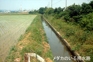下流では、流れのゆるやかなよどんだ水にフナやコイ、モロコなど名前のよく知られた魚が多く生息しています。また池には下流にすむフナやモロコなどがよく見られます。有名なメダカは、川の下流域や、用水路、池などで見つけることができます。
