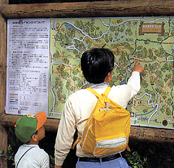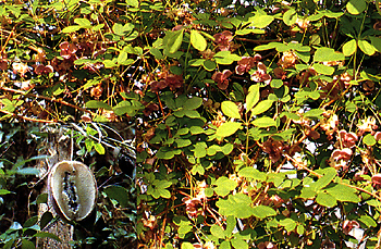 また、テイカカズラ、イタビカズラ、ツタなどが石垣や崖などによじのぼり、アケビが木を巻いているのが見られます。これらの植物は、日あたりのよい林縁に生え、結果的には、林の中の気温や湿度を保つためのへいや垣の役目をしているのです。