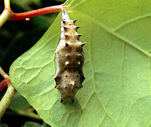 。とげ状の突起で武装しているように見える。表に白い粉をおおっている。蛹こ触れると元気よくうち振る。