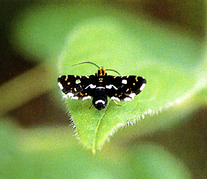 翅をいっぱい拡げても1.5cmほどの小さな蛾であるが、黒地にだいだい色や白の紋をつけ、ありったけのおしゃれをしている。
