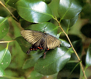 の数が少なく、赤い三日月形の紋が小さく、体も少し小づくりなことのほかはジャコウアゲハにそっくりだ。昼間木陰の葉上で休んでいるのをときどき見る。