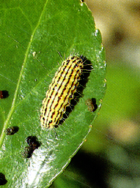 山にはいっていきますと、コマユミ、マユミ、ツルウメモドキといったニシキギ科の低木にあいますが、4月、これらの葉をよく見ると写真のような幼虫をみつけることができます。生垣につかうマサキにも発生します。