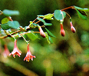 春、暗い紅色の小さな花を下げる落葉低木で梅雨のころには水気の多い赤い実がなる。