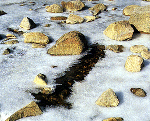 時にはごらんのように氷が張ったり、雪でおおわれることもあるが、0℃近い水の中で春の羽化期にそなえ急速に生長していく仲間もある。