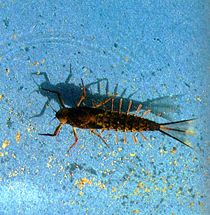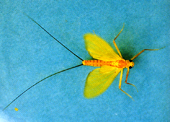 1)カゲロウのなかま:石ころを静かにもちあげてみましょう。すると石の色とよく似た頭でっかちで体が扁平な虫がチョロチョロと動きまわっています。魚をつる人たちは、この虫をチョロムシと呼んでいます。体はわずか1cmあまり、水の流れに逆らわない形をしています。大切な特徴は脚のつめが1コであることで、次のカワゲラのなかまと区別します。尾はほとんどのものが3本、まれに、2本となっています。腹の左右には7対の羽根の形をしたえらがあります。そう類をたべます。