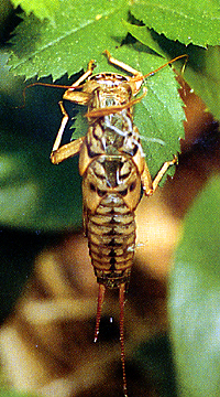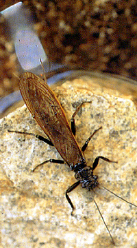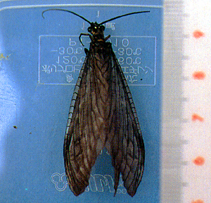 2)カワゲラのなかま:体はカゲロウよりずっと大きく、体はやはり流れに適応して扁平。しかし、必ずつめは2個あるのがカゲロウとの区別点。また、尾は2本でえらは、胸部に糸状のものがあり、カゲロウのように腹部にはありません。また、成虫が休んでいるときは翅を背の上にきちんとたたんでいて、カゲロウのように立てません。肉食、草食両刀使い。