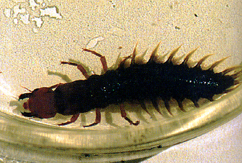 がん状な大あご、8対の突起と7対の糸状え らが生え不気味な格好をしている。肉食性が弱い。その姿からカワムカデともいわれる。 |