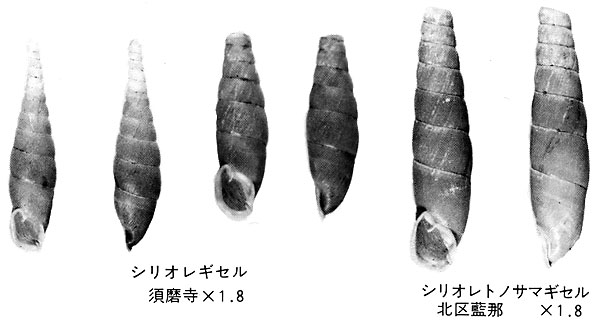 シリオレギセルとシリオレトノサマギセルは外形がよく似ているが、神戸では前者は細くやや小型、殻口の形が平行四辺形をして右下に数本のしわが出ているのに対し、後者は先まで太くやや大型、殻口が丸く右下に1本だけしわ(下軸板)が出るなどの違いがある。殻高(殻頂の脱落した状態で)シリオレギセル18〜22mm、シリオレトノサマギセル22mm〜27mm。