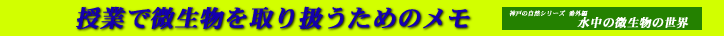 また、水の中の生物が、どのような分類上・進化の上での位置をしめているかも、まったく明らかにされないままの、単なる「微生物」としての扱いは、授業効果を考えると、得られるものが少ないと考えられます。一つの方法は、植物の進化の出発点として「水の中の小さな植物」を扱うことだと考えます。
