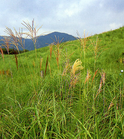 どこの草原にもある大型の多年草です。茎は直立し、大きく伸び2メートルに達するものもあります。葉は互生し、細長い線形で中脈は白く、下の方は長いさやになって茎を包むようになっています。葉のへりは、ざらついて硬く、手が切れることがあります。これは歯のふちに鋭いきょ歯(珪酸体を含み硬い)がついているためです。