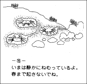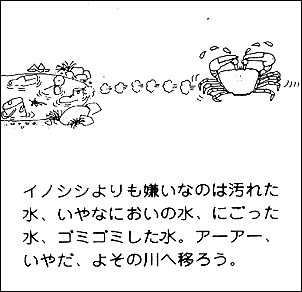 水のきれいな川にしかすめないカニで、水の良し悪しをきめるのに使われるくらいです。サワガニのすむ川の水は○、すんでない川の水は汚れていて×です。