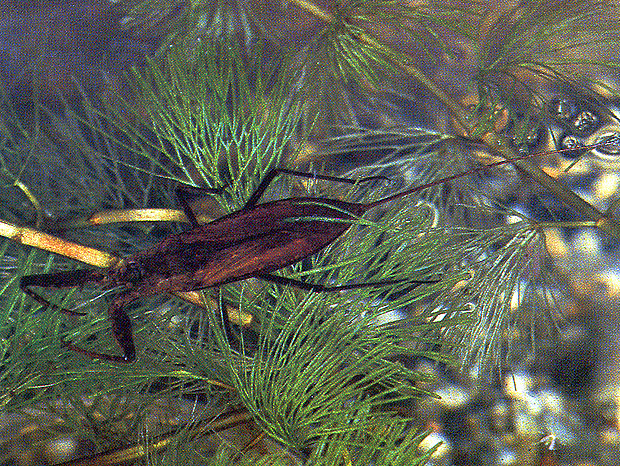 呼吸管を水面に出して呼吸をするので、この虫を捕えて持ち帰るとき、水中に入れて運搬すると弱らせます。ビニール袋にしめらせた水草を入れ、その中に入れて持ち帰ればよいのです。直射日光をあてないかぎり特に空気穴もいりません。水そうを用意し水草を植えると、水草につかまり、オタマジャタシや小魚をねらっている様子、うまく捕えて体液を吸っている様子など、普段、なかなか目につかない光景が見られます。