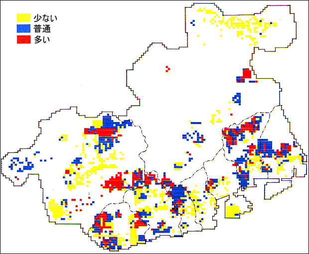 ツクツクオーシ、ツクツクオーシと鳴くこのセミは、全市にわたって広く分布しています。その中でも市街地から山地にかけて報告が多いようです。山道を歩くとかなり高い所でも鳴いています。垂直分布を調べると面白いでしょう。ヒグラシと大きさも姿も似ていて、生息する場所も同じような所です。午後に鳴くことが多いので、ヒグラシとツクツクボウシといっしょに鳴くこともあります。セミの鳴く時間は、1日のうちでもある程度きまっています。それぞれのセミで調べてみましょう。アブラゼミやクマゼミは1日中鳴いていますが、ヒグラシは早朝か夕刻鳴き、日中はほとんど鳴きません。ツクツクボウシは1日中鳴いていますが、とくに夕刻にはげしく鳴きます。ツクツクボウシは灯火に飛来することがあります。街灯などで探してみてはいかがでしょうか。