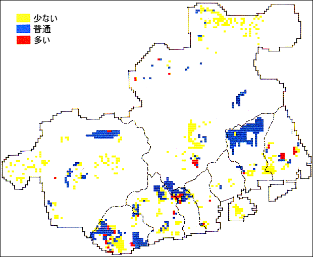 ほんらいのすみ家の里山から都会に進出してきているのが、この分布図からもよくわかります。珍しい例としては、海上人工島の都市ポートアイランドの森にも定着しているのが報告されています。